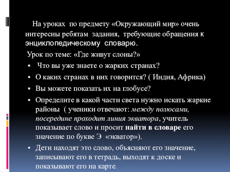 речь, накапливать активный словарный запас. Словари вносят оживление в учебный процесс и положительно влияют на развитие познавательной активности и самостоятельности учащихся.