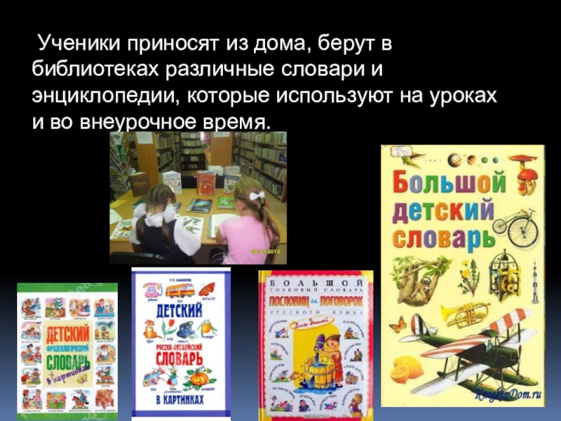 Слайд 11 Ученики приносят из дома, берут в библиотеках различные словари и