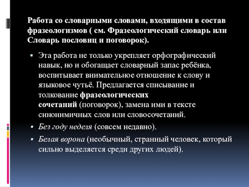 Слайд 21Работа со словарными словами, входящими в состав фразеологизмов ( см. Фразеологический