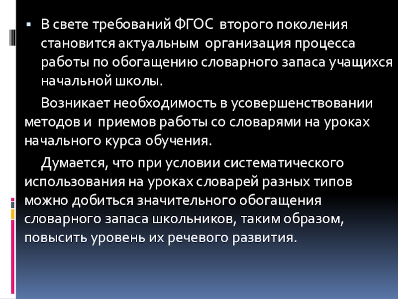Возникает необходимость в усовершенствовании методов и приемов работы со словарями на уроках начального курса обучения.