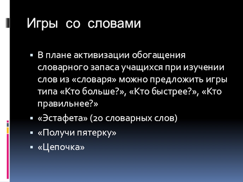 слов из «словаря» можно предложить игры типа «Кто больше?», «Кто быстрее?», «Кто правильнее?»