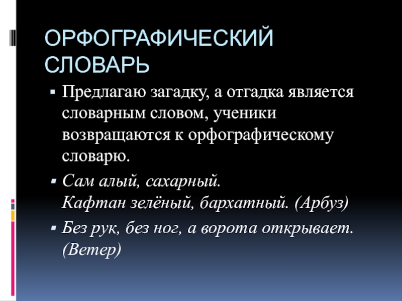 Предлагаю загадку, а отгадка является словарным словом, ученики возвращаются к