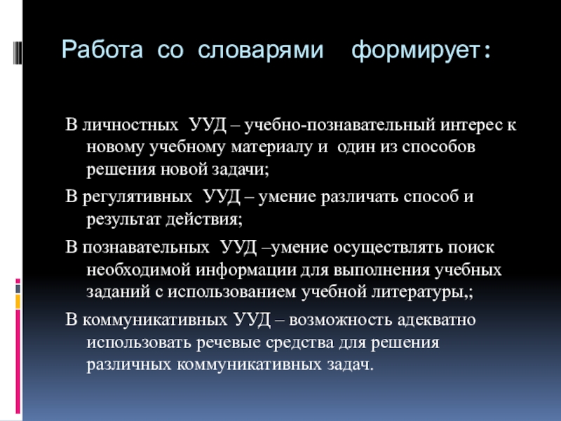 В коммуникативных УУД – возможность адекватно использовать речевые средства для решения различных коммуникативных задач.