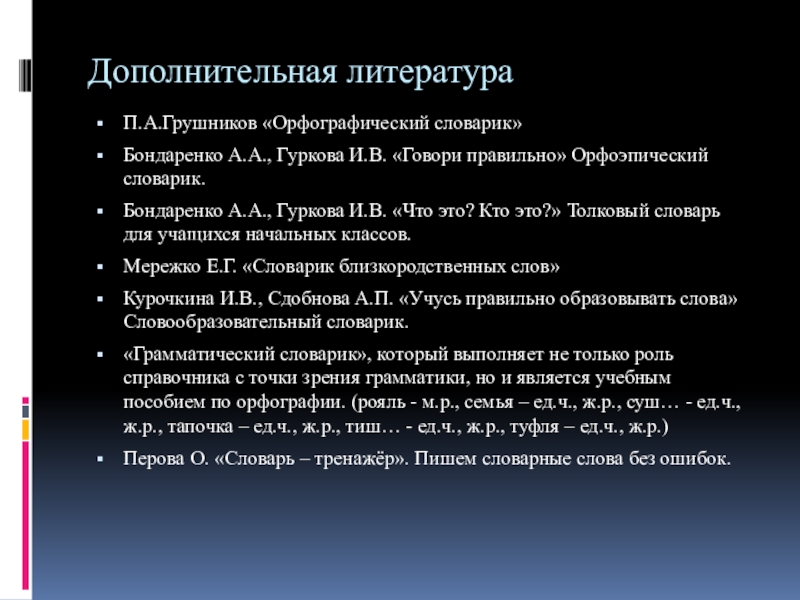 «Грамматический словарик», который выполняет не только роль справочника с точки зрения грамматики, но и является учебным пособием по орфографии. (рояль - м.р., семья – ед.ч., ж.р., суш… - ед.ч., ж.р., тапочка – ед.ч., ж.р., тиш… - ед.ч., ж.р., туфля – ед.ч., ж.р.)