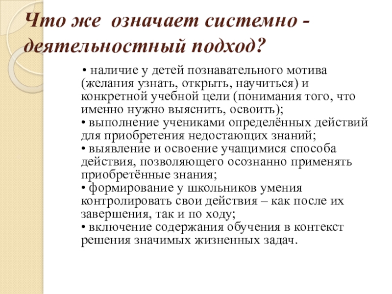 Что же означает системно -деятельностный подход?   • наличие у детей познавательного мотива (желания узнать, открыть,