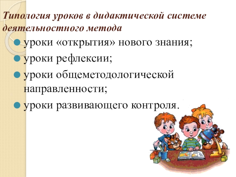 Типология уроков в дидактической системе  деятельностного метода  уроки «открытия» нового знания;уроки рефлексии;уроки общеметодологической направленности;уроки развивающего