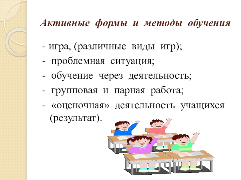 Активные формы и методы обучения- игра, (различные виды игр);- проблемная ситуация;- обучение через деятельность;- групповая и парная работа;- «оценочная» деятельность учащихся (результат).