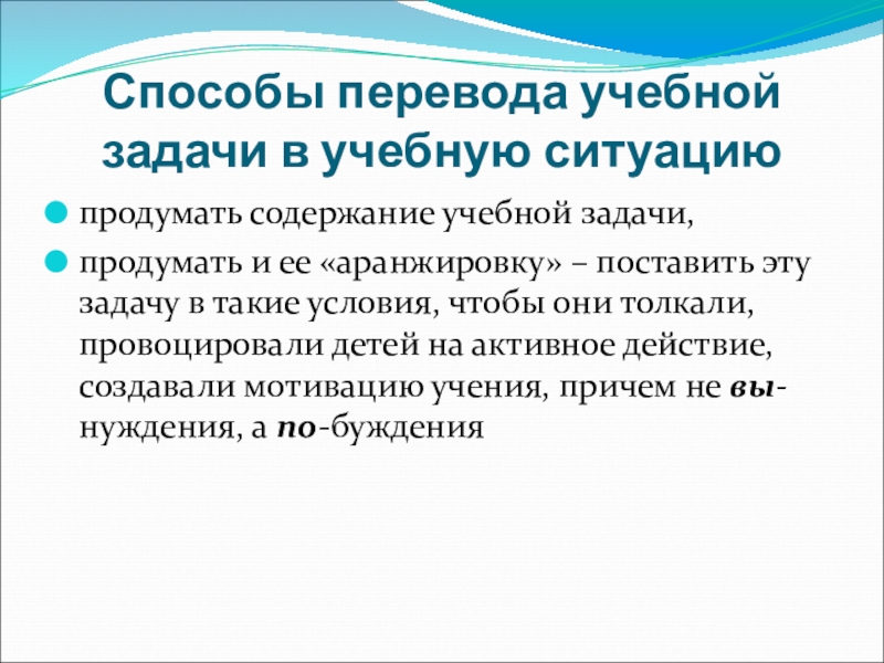 и ее «аранжировку» – поставить эту задачу в такие условия, чтобы они толкали, провоцировали детей на активное действие, создавали мотивацию учения, причем не вы-нуждения, а по-буждения