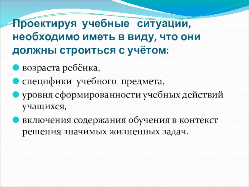 Проектируя учебные ситуации, необходимо иметь в виду, что они должны строиться