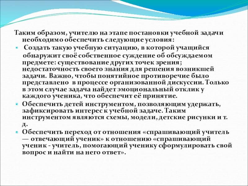 Слайд 22Таким образом, учителю на этапе постановки учебной задачи необходимо обеспечить следующие