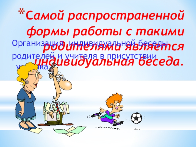 Слайд 35Самой распространенной формы работы с такими родителями является индивидуальная беседа.