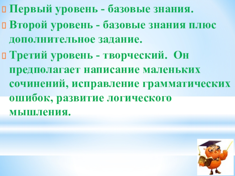 Третий уровень - творческий. Он предполагает написание маленьких сочинений, исправление грамматических ошибок, развитие логического мышления.
