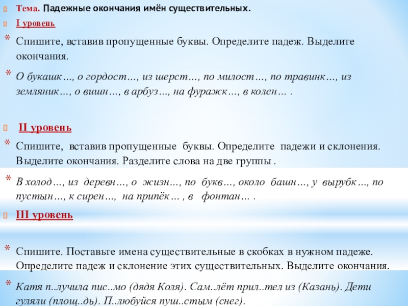Спишите, вставив пропущенные буквы. Определите падежи и склонения. Выделите окончания. Разделите слова на две группы .