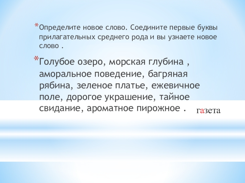 Определите новое слово. Соедините первые буквы прилагательных среднего рода и вы