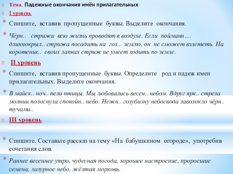 Спишите, вставив пропущенные буквы. Определите род и падеж имен прилагательных. Выделите окончания.
