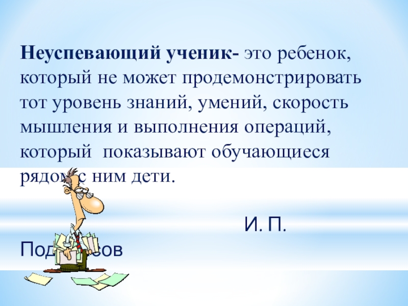 Неуспевающий ученик- это ребенок, который не может продемонстрировать тот уровень знаний,