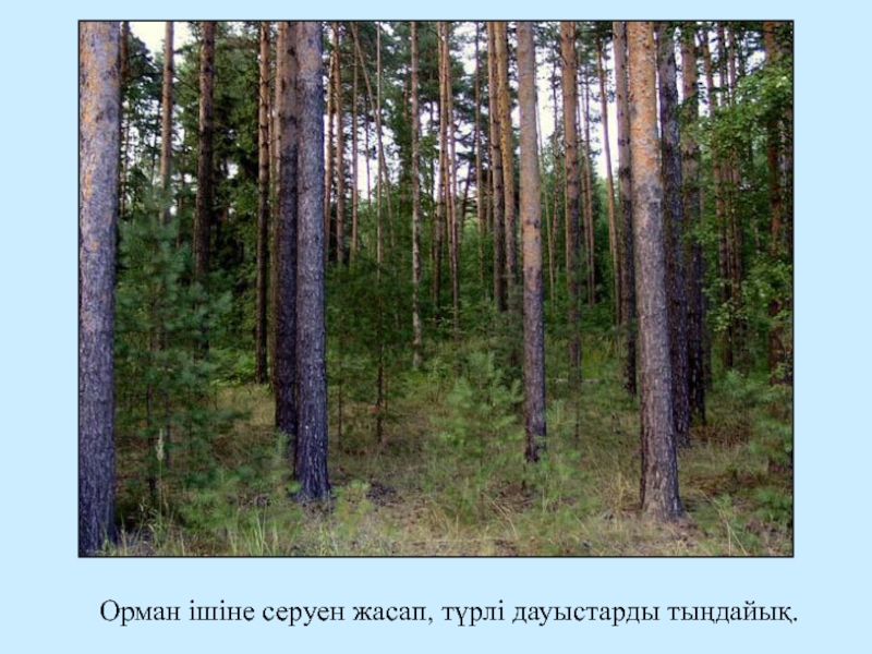 Слайд 2Орман ішіне серуен жасап, түрлі дауыстарды тыңдайық.