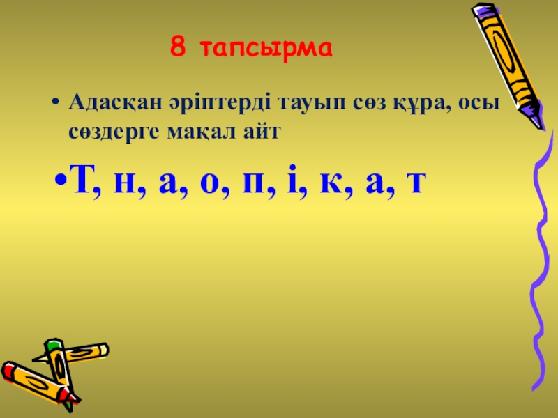 8 тапсырмаАдасқан әріптерді тауып сөз құра, осы сөздерге
