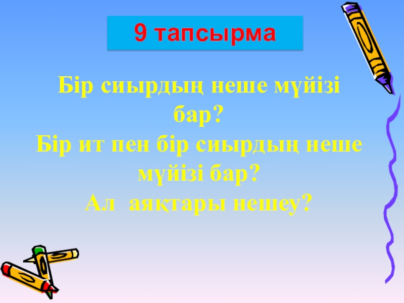 9 тапсырма    Бір сиырдың неше мүйізі бар? Бір ит пен бір сиырдың неше мүйізі
