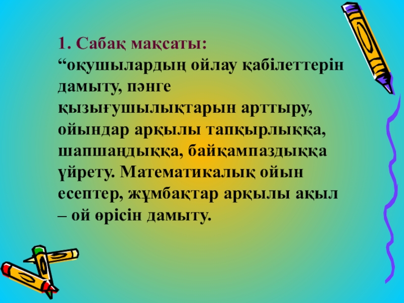 Слайд 2 1. Сабақ мақсаты: “оқушылардың ойлау қабілеттерін дамыту, пәнге қызығушылықтарын арттыру, ойындар арқылы