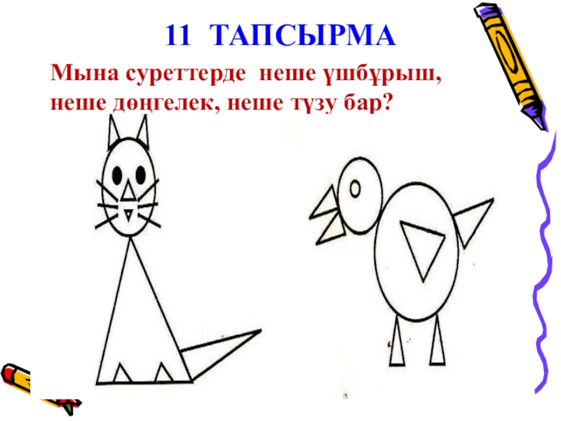 11 ТАПСЫРМАМына суреттерде неше үшбұрыш, неше дөңгелек, неше түзу бар?