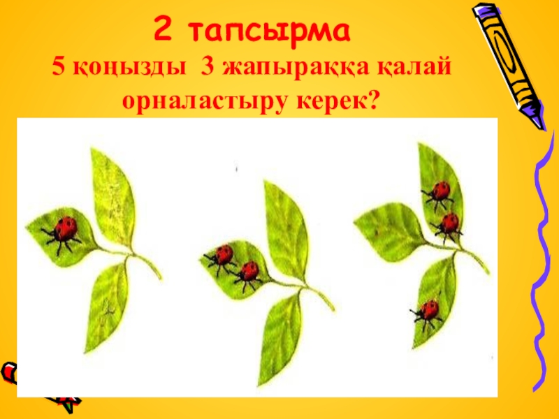 Слайд 52 тапсырма 5 қоңызды 3 жапыраққа қалай орналастыру керек?