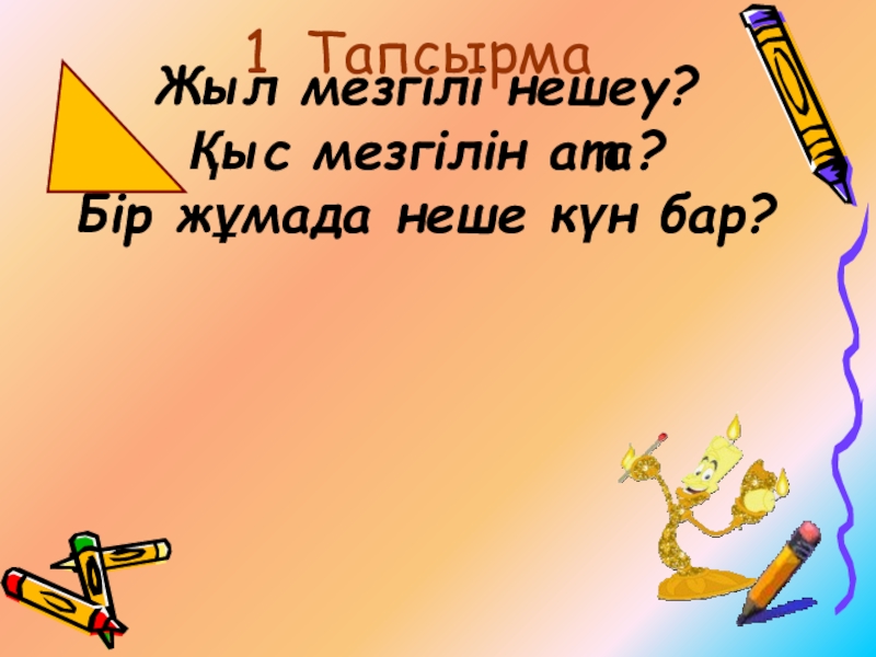 Слайд 4 Жыл мезгілі нешеу? Қыс мезгілін ата? Бір жұмада неше күн