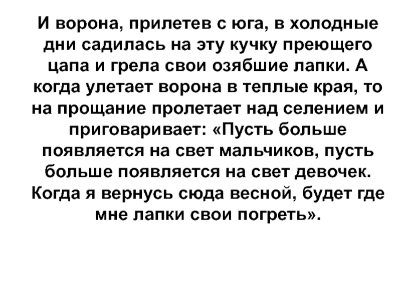 на эту кучку преющего цапа и грела свои озябшие лапки. А когда улетает ворона в теплые края, то на прощание пролетает над селением и приговаривает: «Пусть больше появляется на свет мальчиков, пусть больше появляется на свет девочек. Когда я вернусь сюда весной, будет где мне лапки свои погреть».