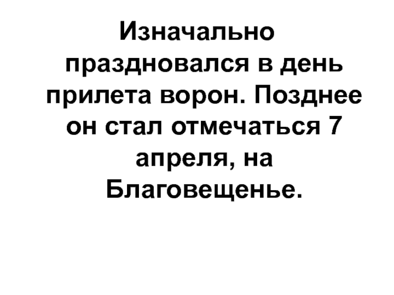 Слайд 19Изначально праздновался в день прилета ворон. Позднее он стал отмечаться 7