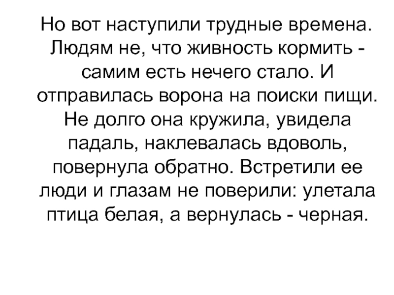 кормить - самим есть нечего стало. И отправилась ворона на поиски пищи. Не долго она кружила, увидела падаль, наклевалась вдоволь, повернула обратно. Встретили ее люди и глазам не поверили: улетала птица белая, а вернулась - черная.