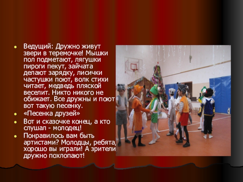 Ведущий: Дружно живут звери в теремочке! Мышки пол подметают, лягушки пироги