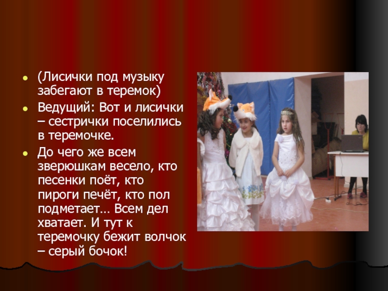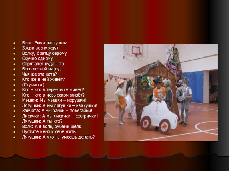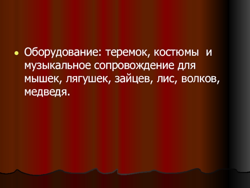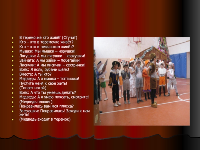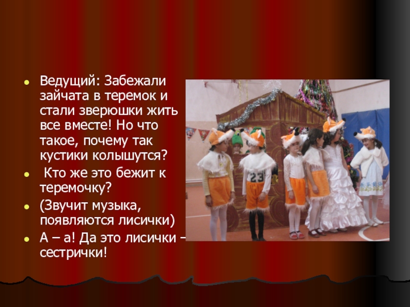 Оборудование: теремок, костюмы и музыкальное сопровождение для мышек, лягушек, зайцев, лис,