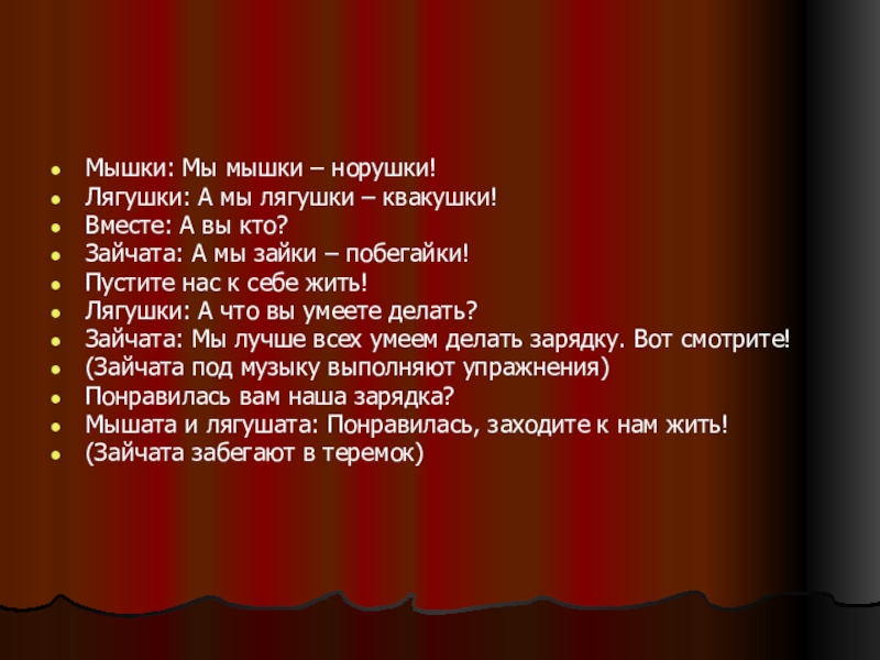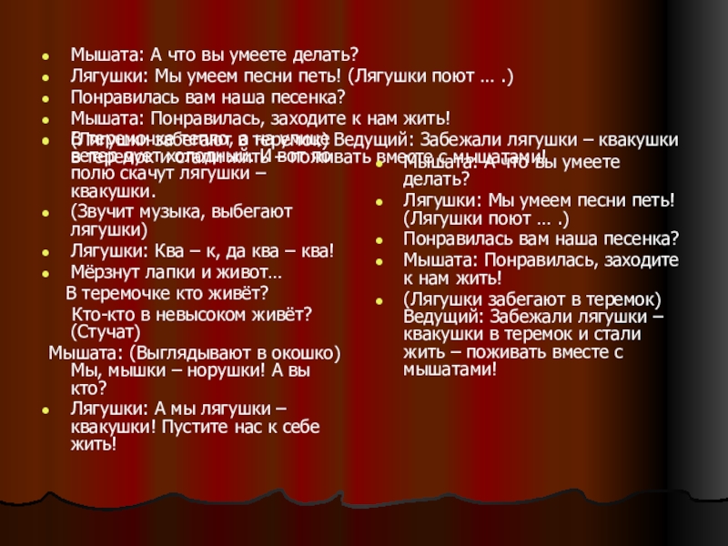 (Лягушки забегают в теремок) Ведущий: Забежали лягушки – квакушки в теремок и стали жить – поживать вместе с мышатами!