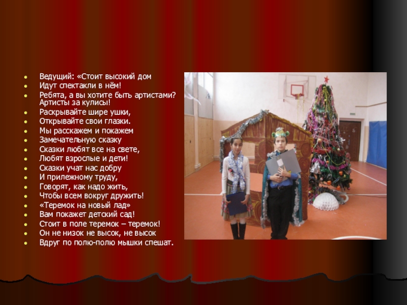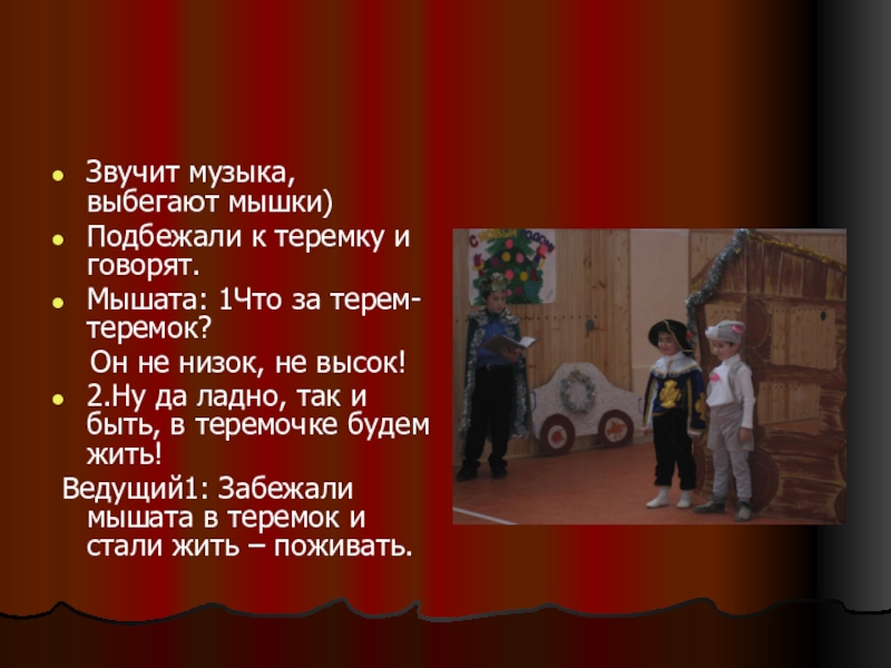 Ведущий1: Забежали мышата в теремок и стали жить – поживать.