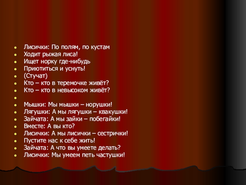 Мышата: (Выглядывают в окошко) Мы, мышки – норушки! А вы кто?
