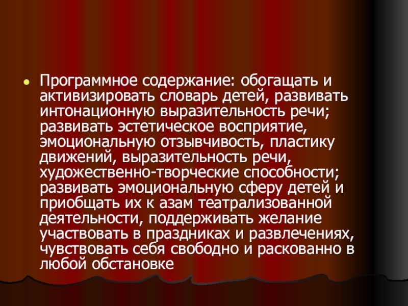 развивать эстетическое восприятие, эмоциональную отзывчивость, пластику движений, выразительность речи, художественно-творческие способности; развивать эмоциональную сферу детей и приобщать их к азам театрализованной деятельности, поддерживать желание участвовать в праздниках и развлечениях, чувствовать себя свободно и раскованно в любой обстановке