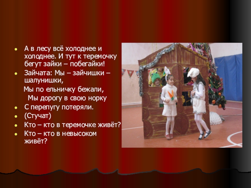 (Зайчата забегают в теремок)