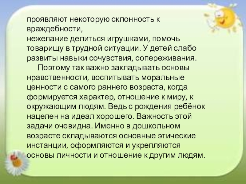 Поэтому так важно закладывать основы нравственности, воспитывать моральные ценности с самого раннего возраста, когда формируется характер, отношение к миру, к окружающим людям. Ведь с рождения ребёнок нацелен на идеал хорошего. Важность этой задачи очевидна. Именно в дошкольном возрасте складываются основные этические инстанции, оформляются и укрепляются основы личности и отношение к другим людям.