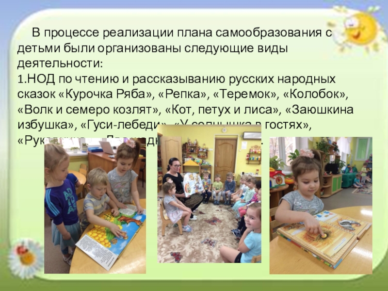 1.НОД по чтению и рассказыванию русских народных сказок «Курочка Ряба», «Репка», «Теремок», «Колобок», «Волк и семеро козлят», «Кот, петух и лиса», «Заюшкина избушка», «Гуси-лебеди», «У солнышка в гостях», «Рукавичка», «Два жадных медвежонка».