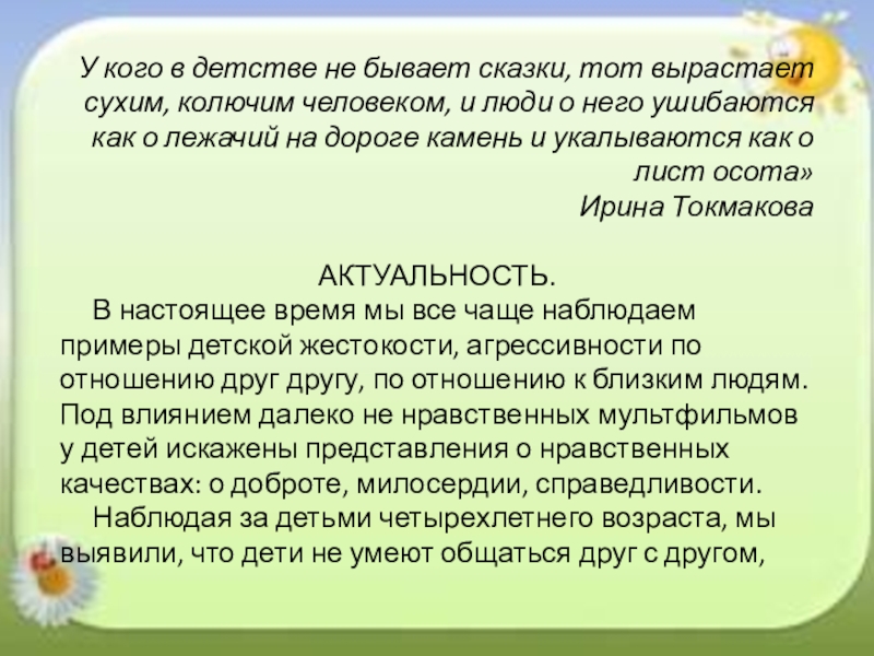 Слайд 2У кого в детстве не бывает сказки, тот вырастает сухим, колючим