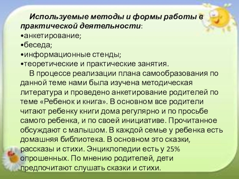 В процессе реализации плана самообразования по данной теме нами была изучена методическая литература и проведено анкетирование родителей по теме «Ребенок и книга». В основном все родители читают ребенку книги дома регулярно и по просьбе самого ребенка, и по своей инициативе. Прочитанное обсуждают с малышом. В каждой семье у ребенка есть домашняя библиотека. В основном это сказки, рассказы и стихи. Энциклопедии есть у 25% опрошенных. По мнению родителей, дети предпочитают слушать сказки и стихи.