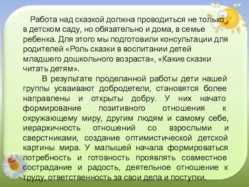 детском саду, но обязательно и дома, в семье ребенка. Для этого мы подготовили консультации для родителей «Роль сказки в воспитании детей младшего дошкольного возраста», «Какие сказки читать детям».