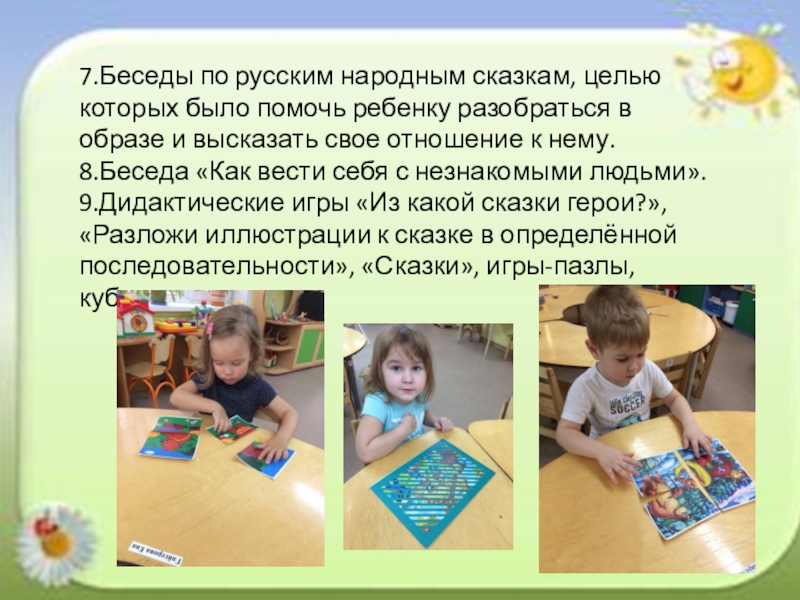 9.Дидактические игры «Из какой сказки герои?», «Разложи иллюстрации к сказке в определённой последовательности», «Сказки», игры-пазлы, кубики.