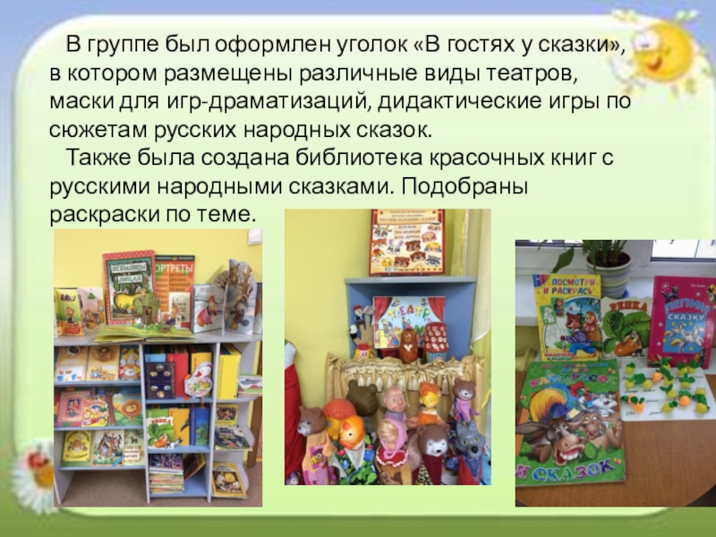 Слайд 7 В группе был оформлен уголок «В гостях у сказки»,