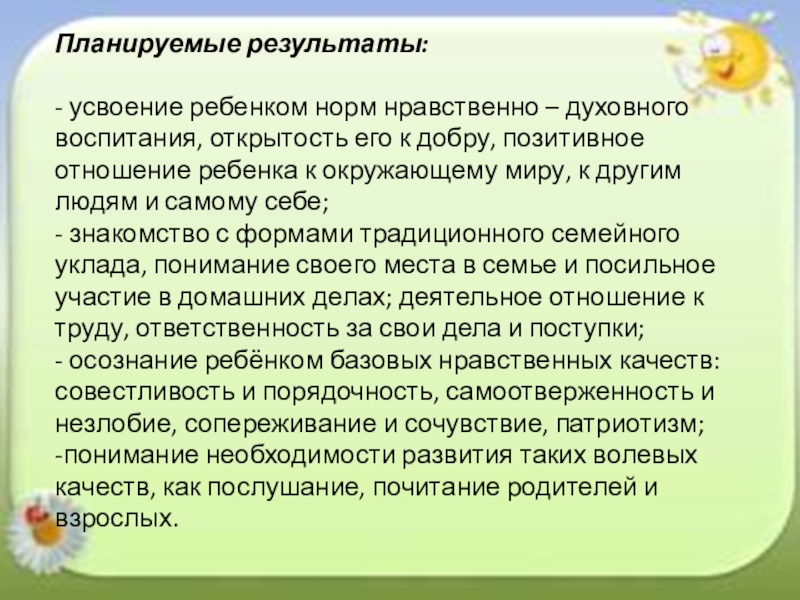 - усвоение ребенком норм нравственно – духовного воспитания, открытость его