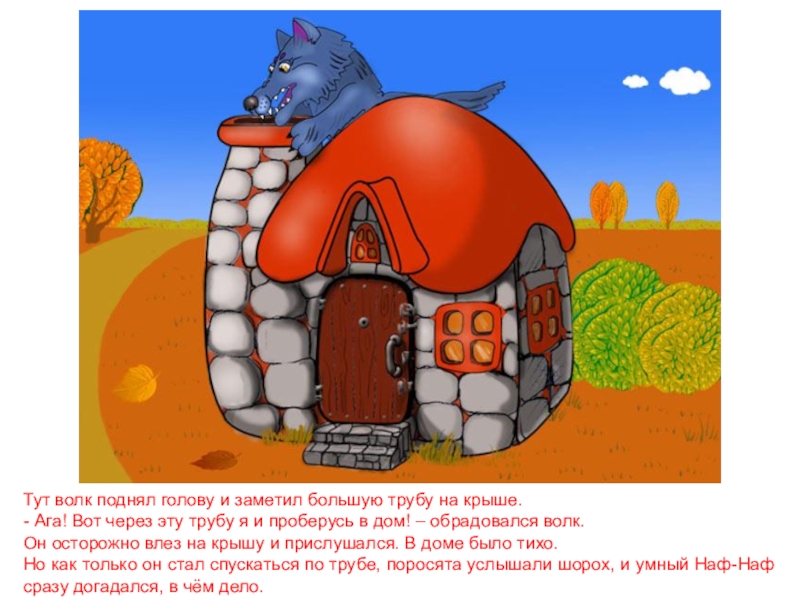 Слайд 10Тут волк поднял голову и заметил большую трубу на крыше.