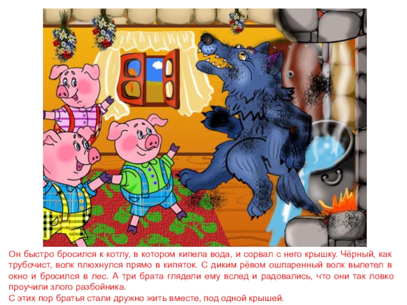 с него крышку. Чёрный, как трубочист, волк плюхнулся прямо в кипяток. С диким рёвом ошпаренный волк вылетел в окно и бросился в лес. А три брата глядели ему вслед и радовались, что они так ловко проучили злого разбойника.