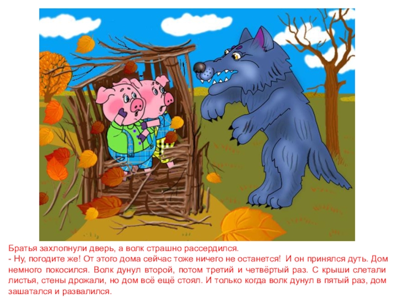 Слайд 7Братья захлопнули дверь, а волк страшно рассердился.