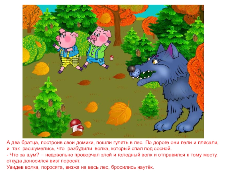 Слайд 5А два братца, построив свои домики, пошли гулять в лес. По