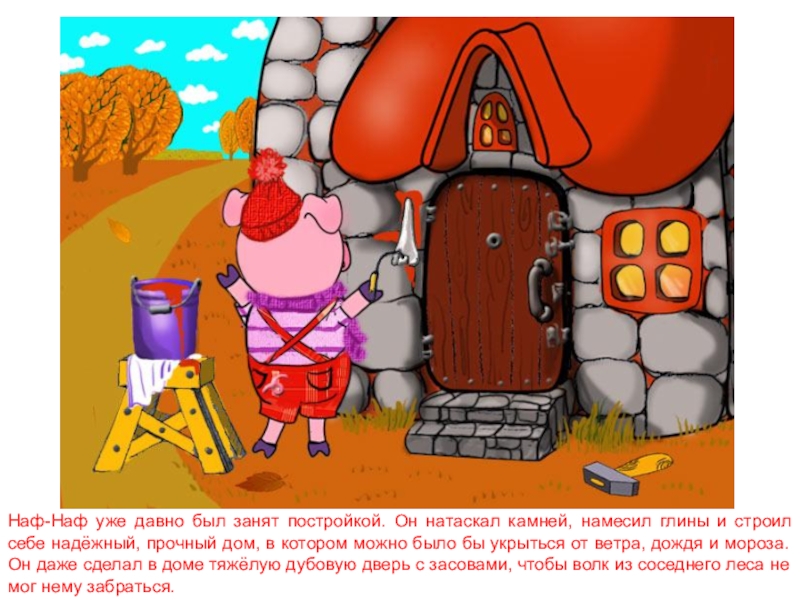 Слайд 4Наф-Наф уже давно был занят постройкой. Он натаскал камней, намесил глины